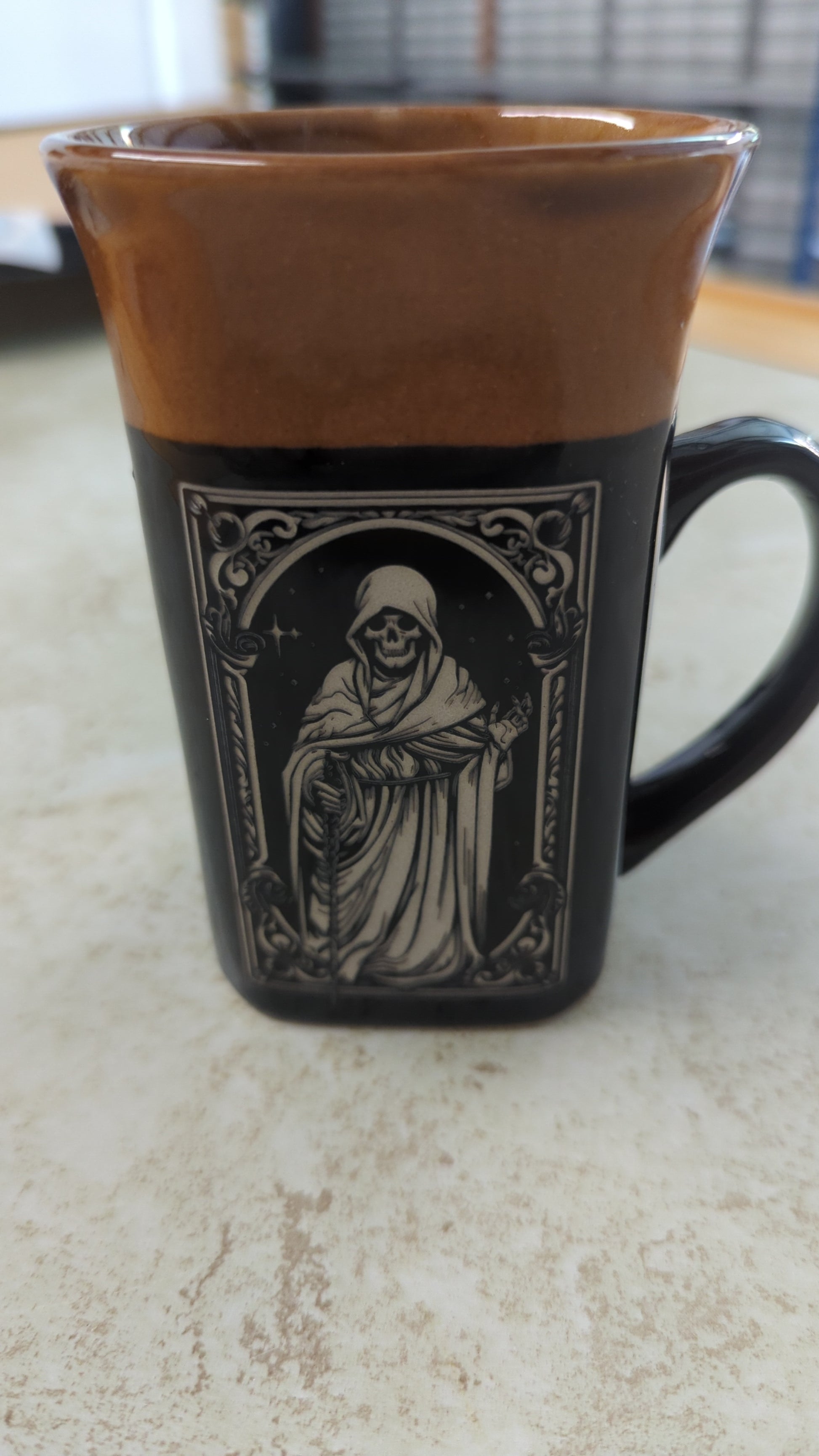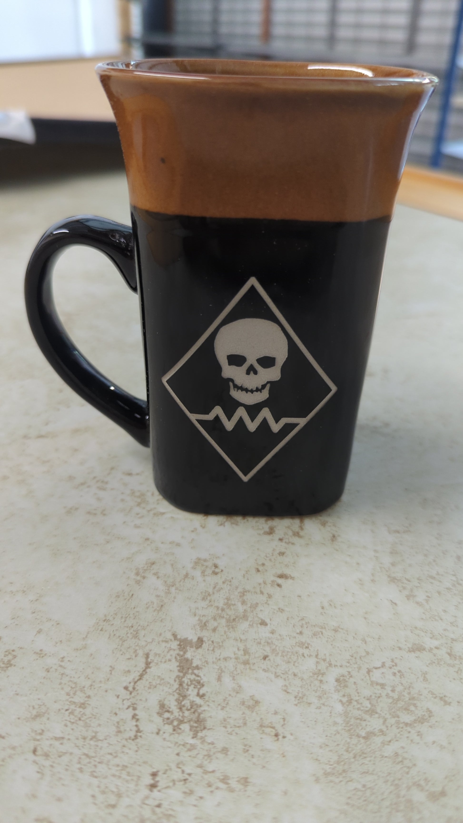 Exclusive collab with my friend Cultivated Laser, the coffee mug is a stonewear mug with Cultivated Laser's custom Creeping Death design on one side and the Brushbeater Contra Resistor patch on the other. Drink coffee in style!